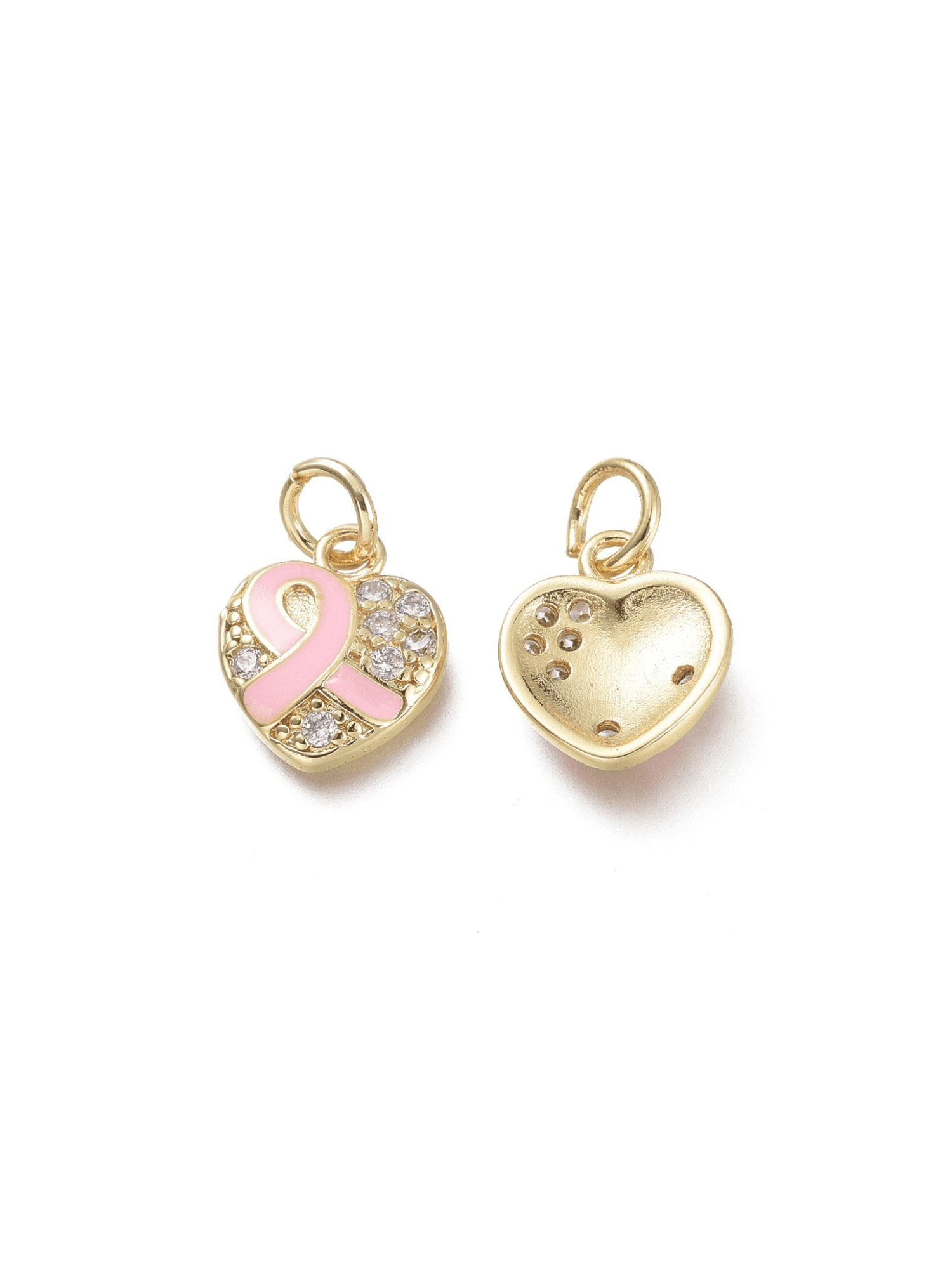 This breast cancer ribbon heart charm symbolizes strength and hope for those affected by breast cancer. Made with sparkling details, it serves as a beautiful reminder of the fight against this disease. Show your support and wear this charm with pride.