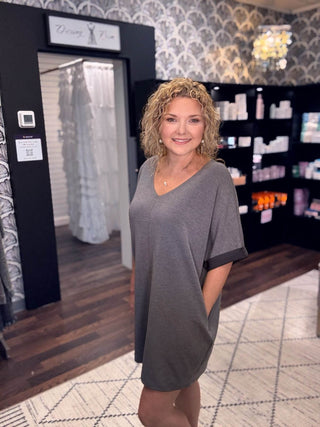 You will love wearing our Charcoal V-Neck Dress signature collection.