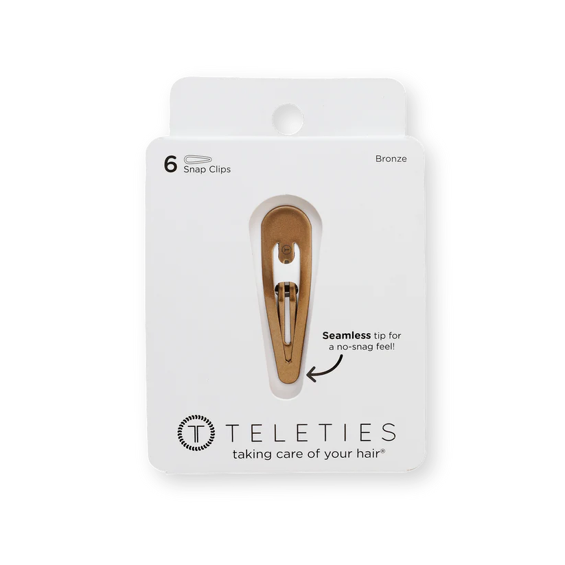 TELETIES Bronze Snap Clips (6ct) in Brown offer a secure seamless tip for a no snag feel. Perfect for all hair types, these stylish barrettes provide a gentle yet firm hold, whether you're styling or simply pulling back strands. Available in a range of colors, TELETIES Snap Clips combine functionality with flair, ensuring your hair stays put all day long.