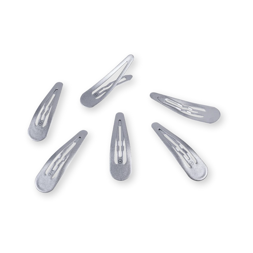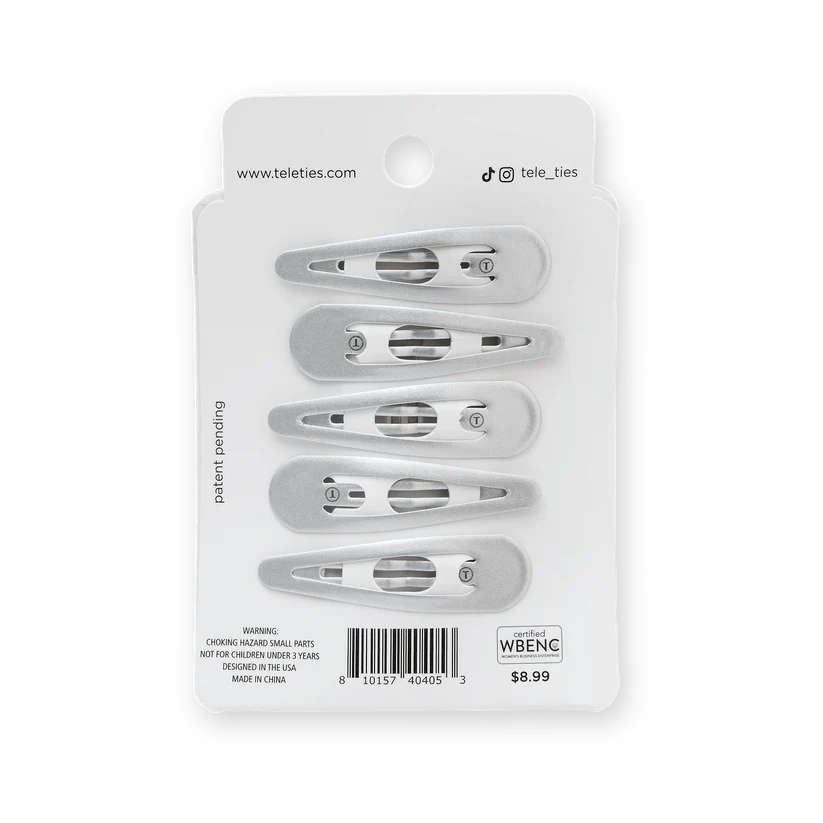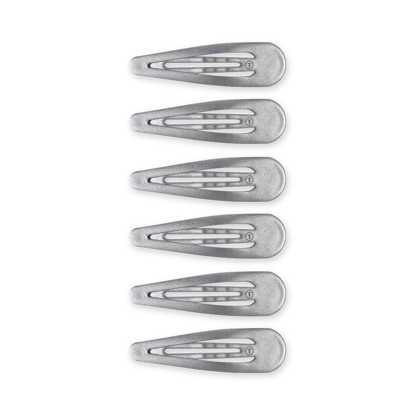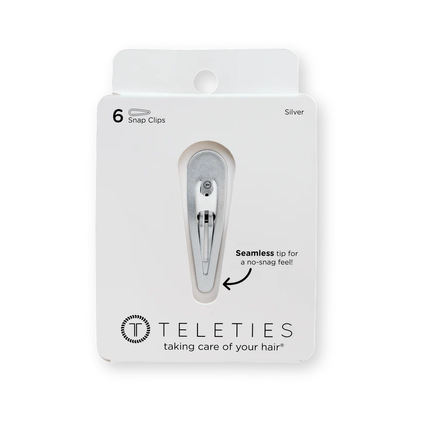 TELETIES Silver Snap Clips (6Ct) in Gray offer a secure seamless tip for a no snag feel. Perfect for all hair types, these stylish barrettes provide a gentle yet firm hold, whether you're styling or simply pulling back strands. Available in a range of colors, TELETIES Snap Clips combine functionality with flair, ensuring your hair stays put all day long.