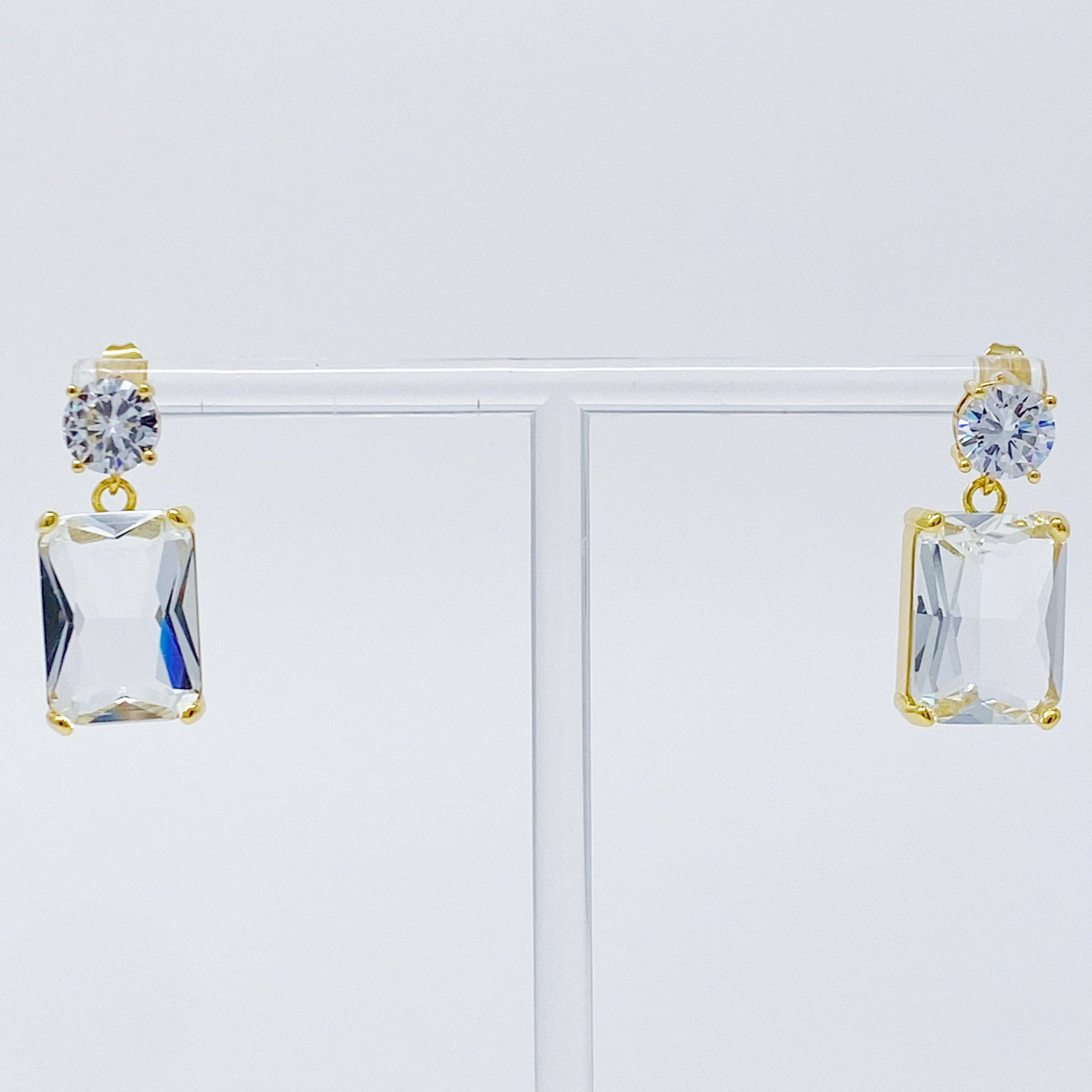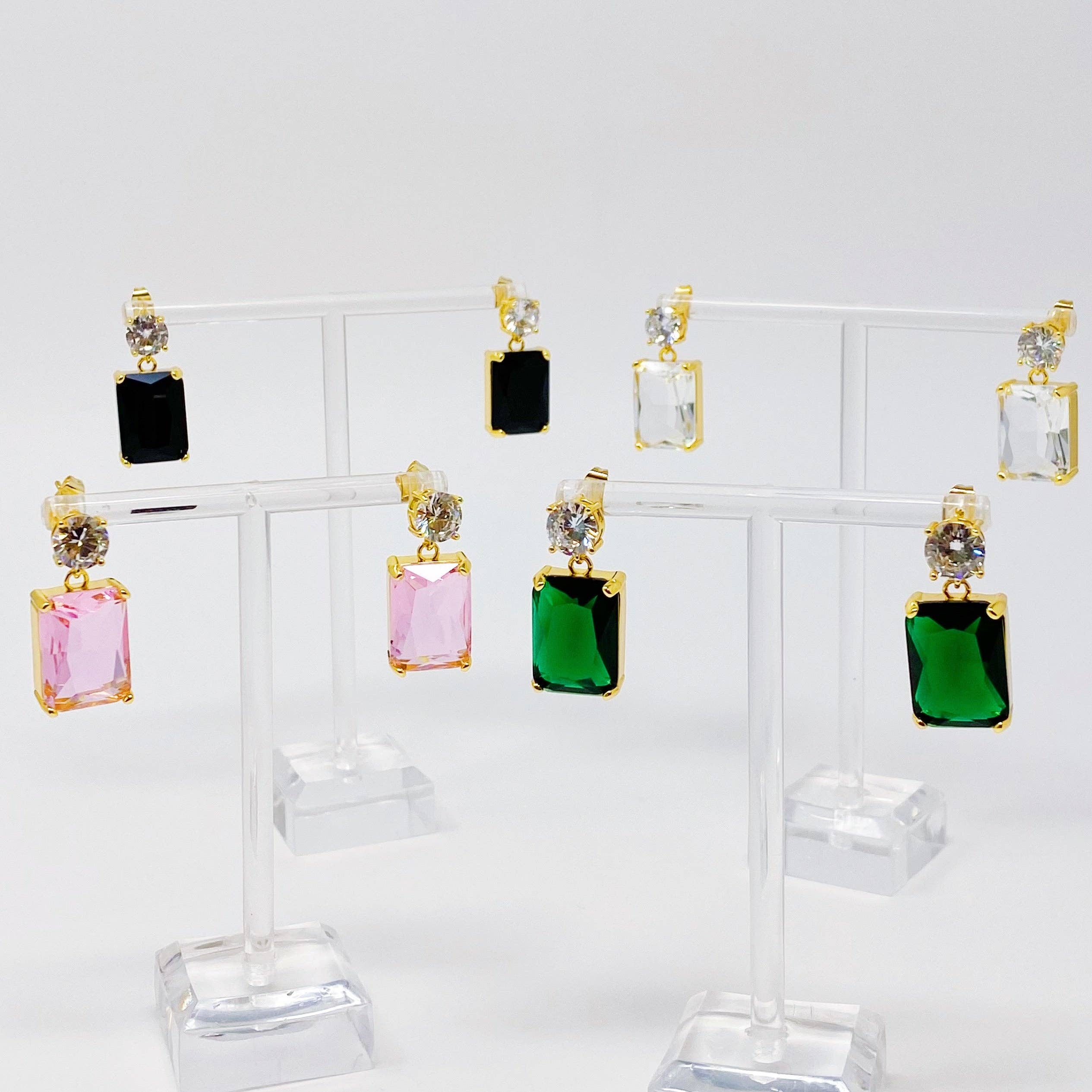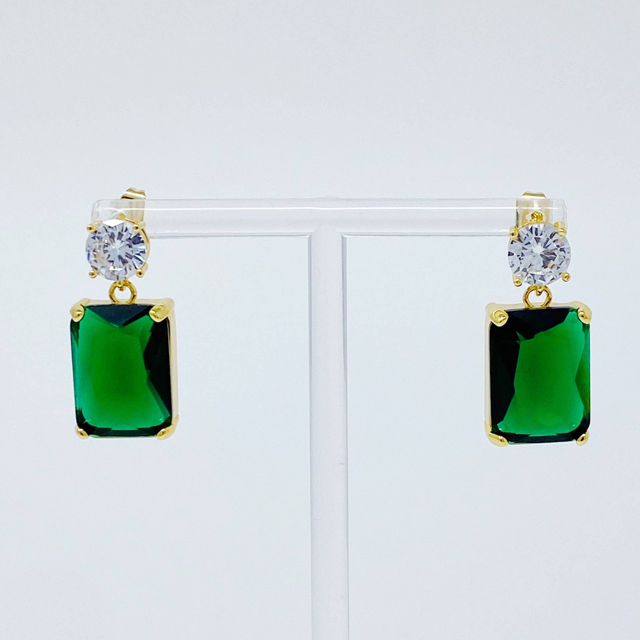 Add a touch of luxury with these glamorous Banquet In Castle Jewel Earrings. Featuring a stunning baguette-cut jewel with a 1-carat round cubic zirconia, these statement earrings will give any outfit the perfect finishing touch. Available in an array of gorgeous colors, you can pick a single pair or collect them all. Dimensions: approximately 1” drop Gold plated Brass, Glass jewels, Cubic Zirconia Lead and Nickel Free