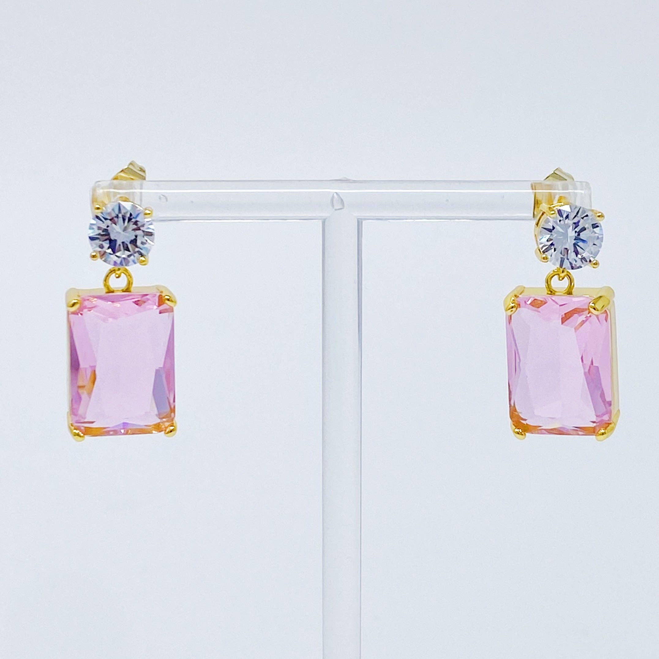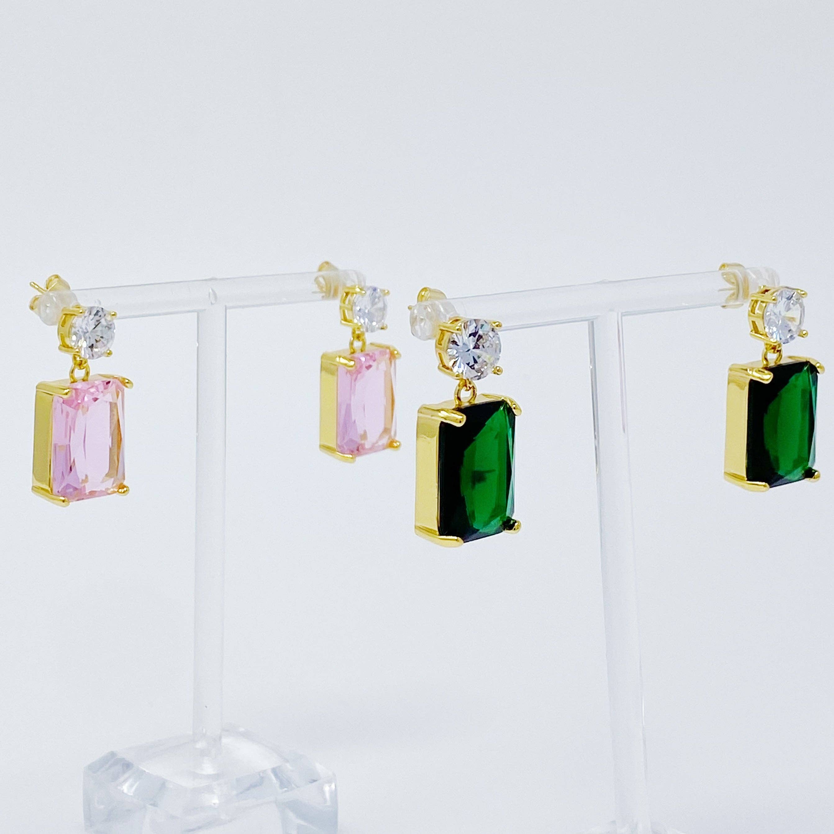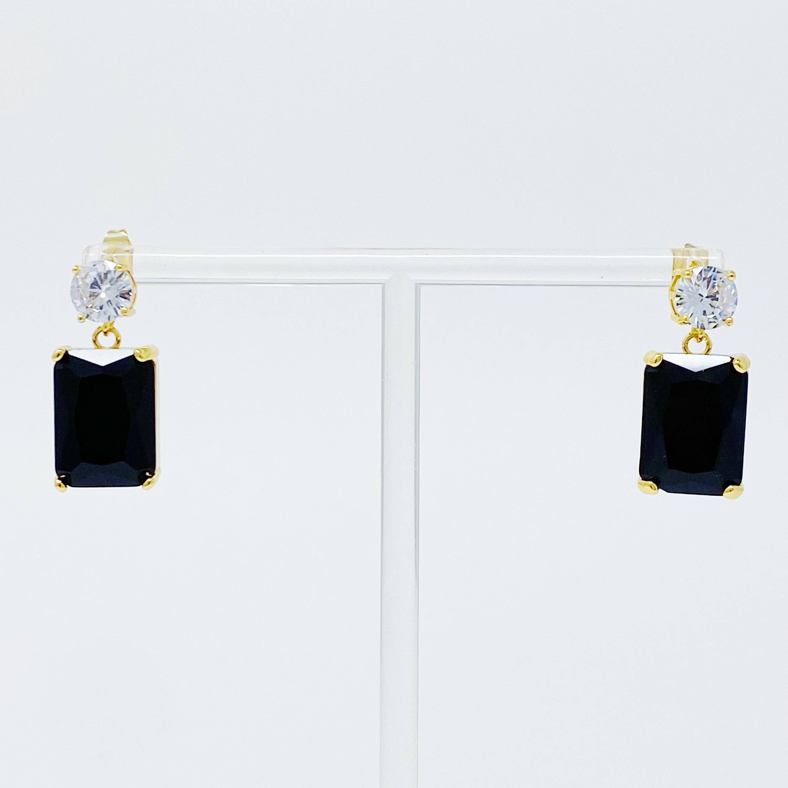 Add a touch of luxury with these glamorous Banquet In Castle Jewel Earrings. Featuring a stunning baguette-cut jewel with a 1-carat round cubic zirconia, these statement earrings will give any outfit the perfect finishing touch. Available in an array of gorgeous colors, you can pick a single pair or collect them all. Dimensions: approximately 1” drop Gold plated Brass, Glass jewels, Cubic Zirconia Lead and Nickel Free