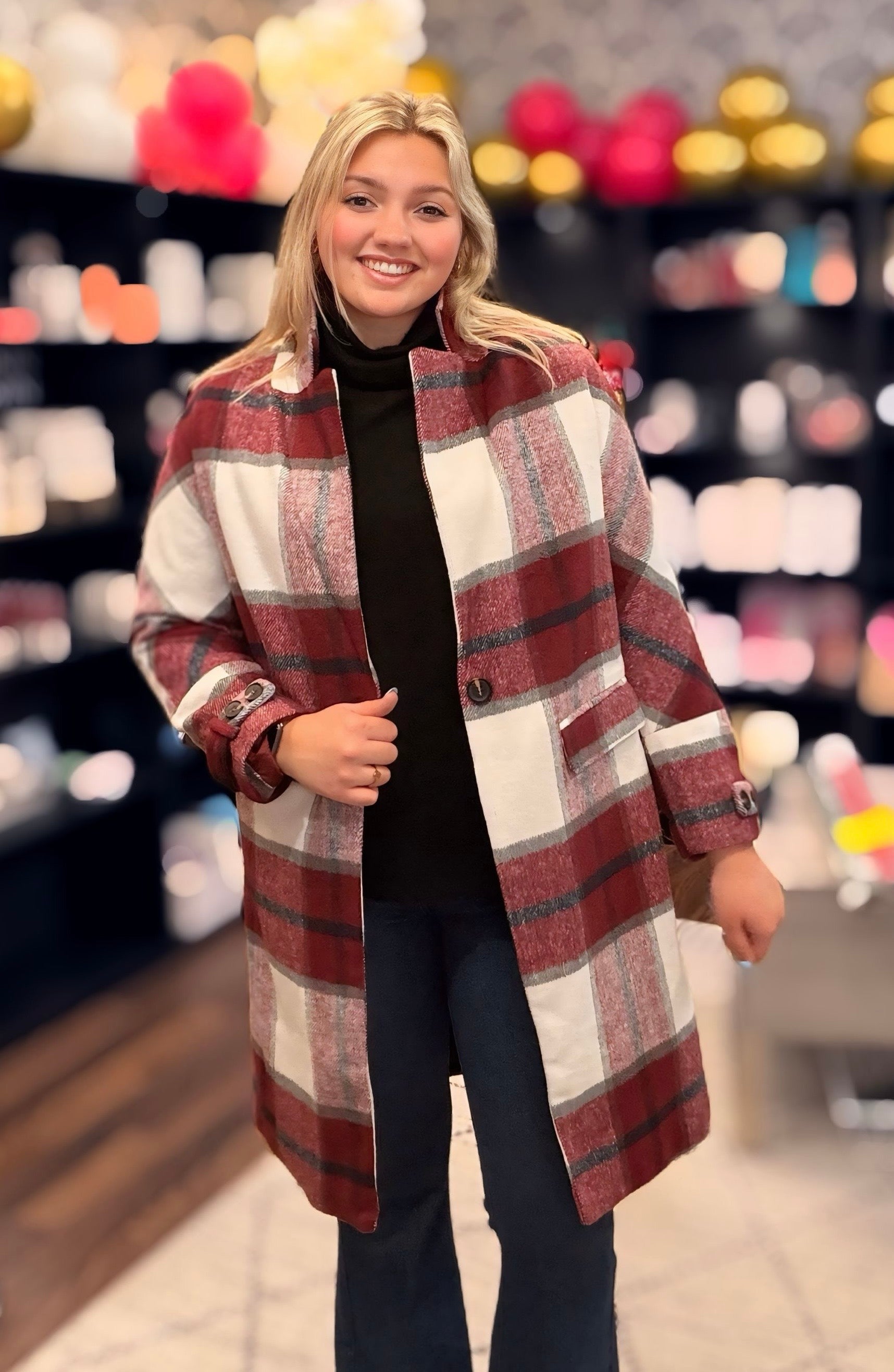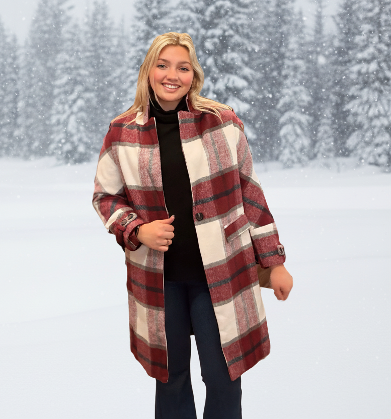 The Red Plaid Coat is a timeless addition to your wardrobe that effortlessly combines classic charm with modern style. Crafted with a fully lined interior, this coat ensures comfort and warmth, making it ideal for chilly days. The intricate button details add a sophisticated touch, enhancing its visual appeal while offering secure closure and ease of wear. Whether dressing up for an occasion or seeking a cozy layer for everyday outings, the Red Plaid Coat offers versatility and enduring style. This Red Plaid Coat is your go-to piece for elevating any outfit with confidence and flair. Embrace the season with the rich colors and quality craftsmanship of the Red Plaid Coat, designed to keep you both stylish and comfortable.
