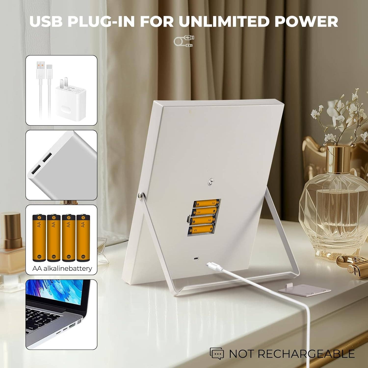Dual Power Supply: This mirror can be powered by either batteries (batteries not included) or USB, offering flexibility and convenience.