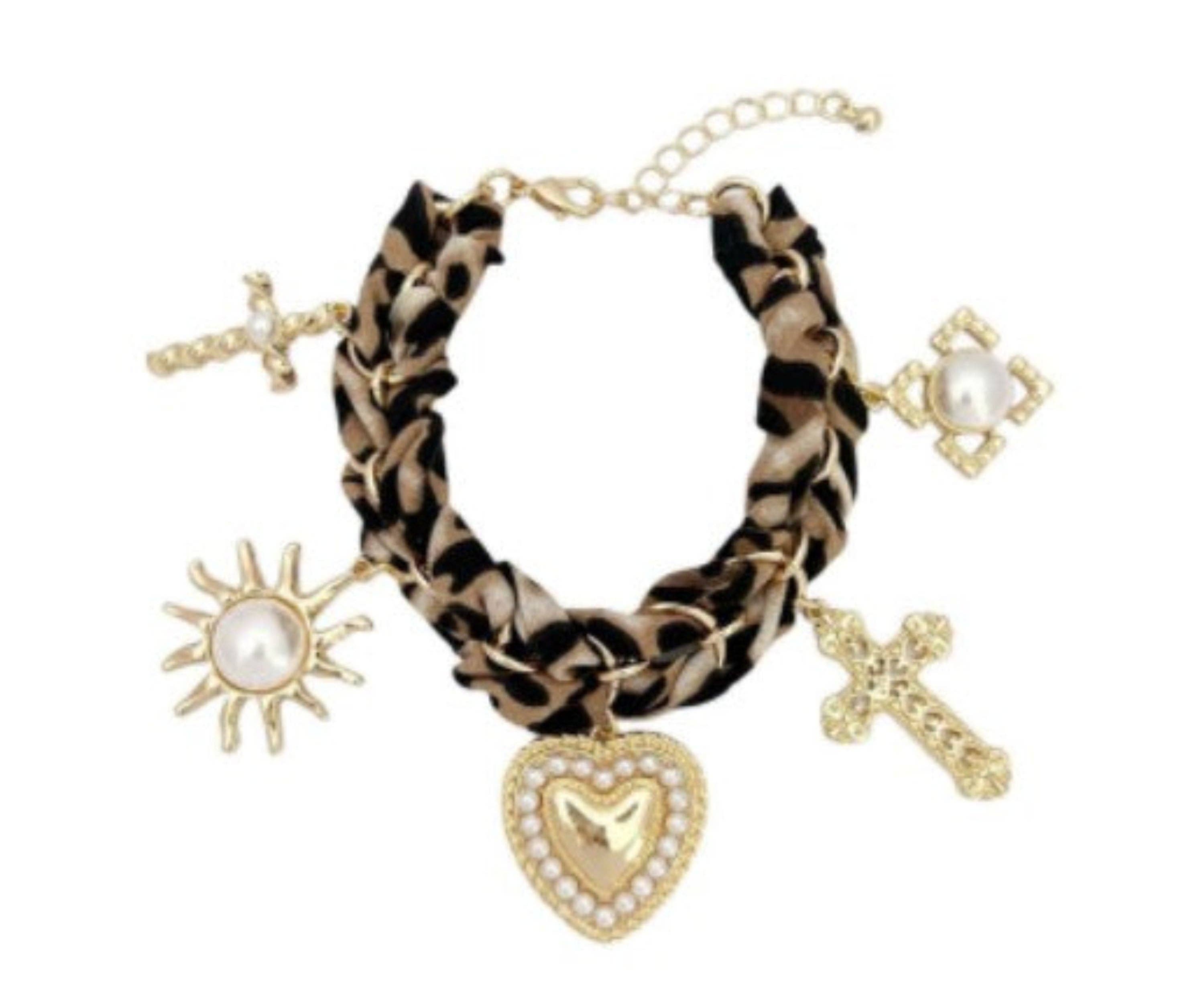 Add a romantic twist to your wrist with the Divine Heart Charm Scarf Bracelet. This elegant accessory features a soft printed scarf paired with a delicate heart charm, creating the perfect blend of sweetness and style. ✔️ Romantic Charm Detail – Features a dainty heart for a lovely touch ✔️ Soft Scarf Wrap – Comfortable, adjustable fit with effortless flair ✔️ Stylish Statement – An easy way to elevate your accessory game Dimensions: 6" w/ 2" extender Materials: Printed scarf, gold-tone plated Lead and nickel free.