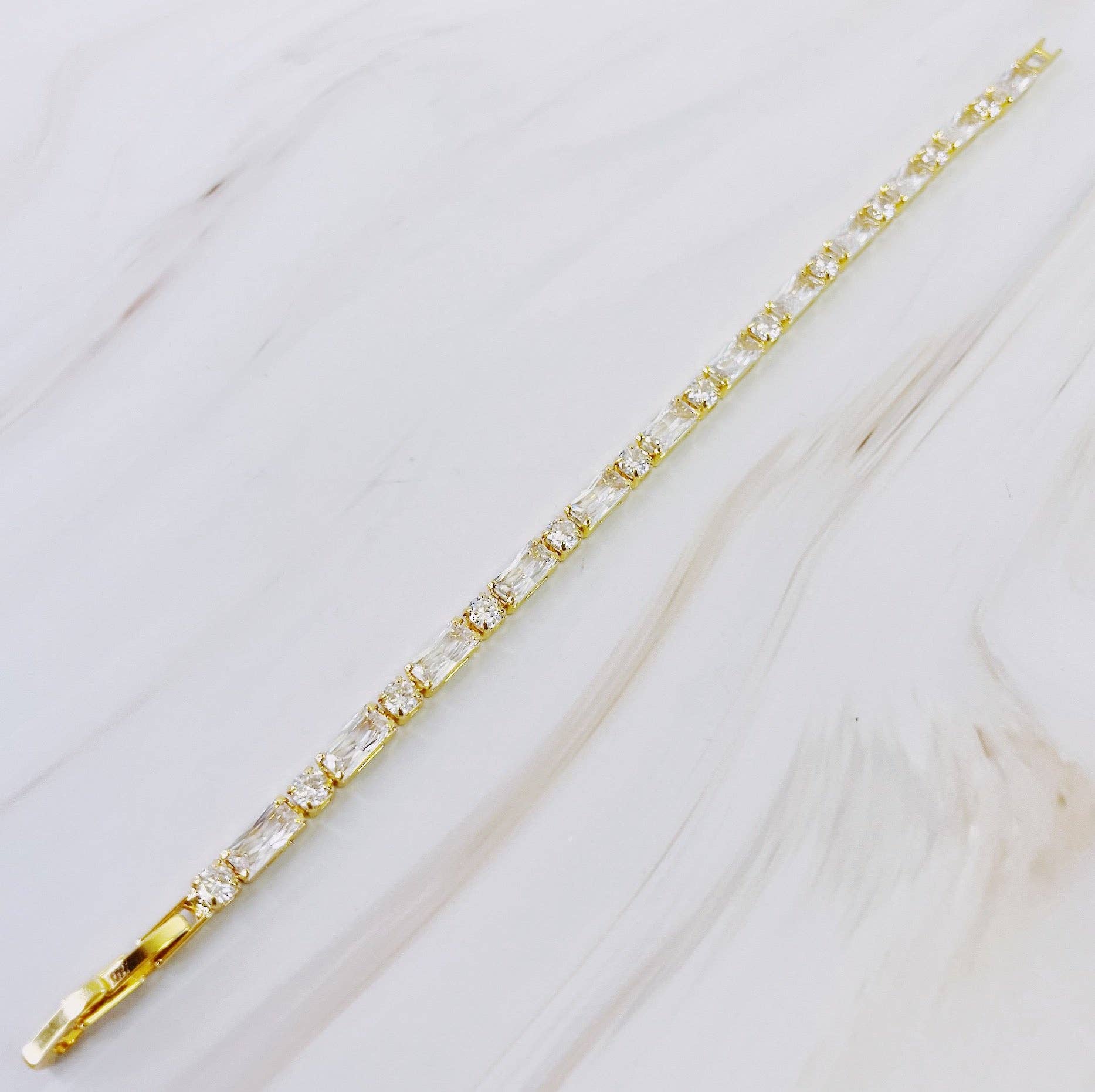 Introducing our Mixed Shape Sparkle Bracelet, featuring a unique and modern design with a touch of elegance. The mix of shapes adds a contemporary flair, while the sparkling details add a touch of glamour. Dimensions: approximately 6.5" with snap closure, has an extra snap closure to adjust size 18k gold plated brass Lead and Nickel free Crafted in China