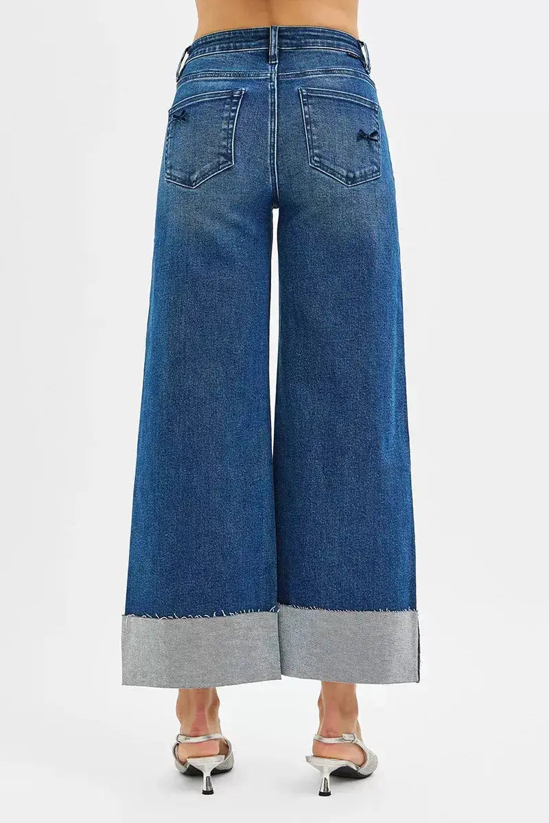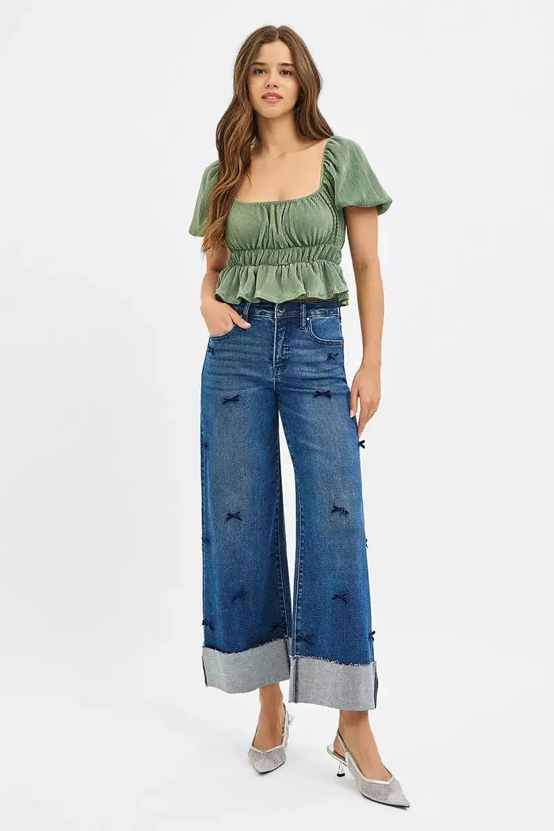 The high rise crop wide leg ribbon detail jeans are a stylish and unique choice for your denim collection. The high rise fit offers a flattering silhouette and on-trend look. The wide leg design adds a relaxed and fashion-forward vibe to the jeans. The ribbon detailing on the sides adds a fun and feminine touch. Pair these jeans with a tucked-in blouse or crop top to showcase the ribbon detail and create a chic and trendy outfit.