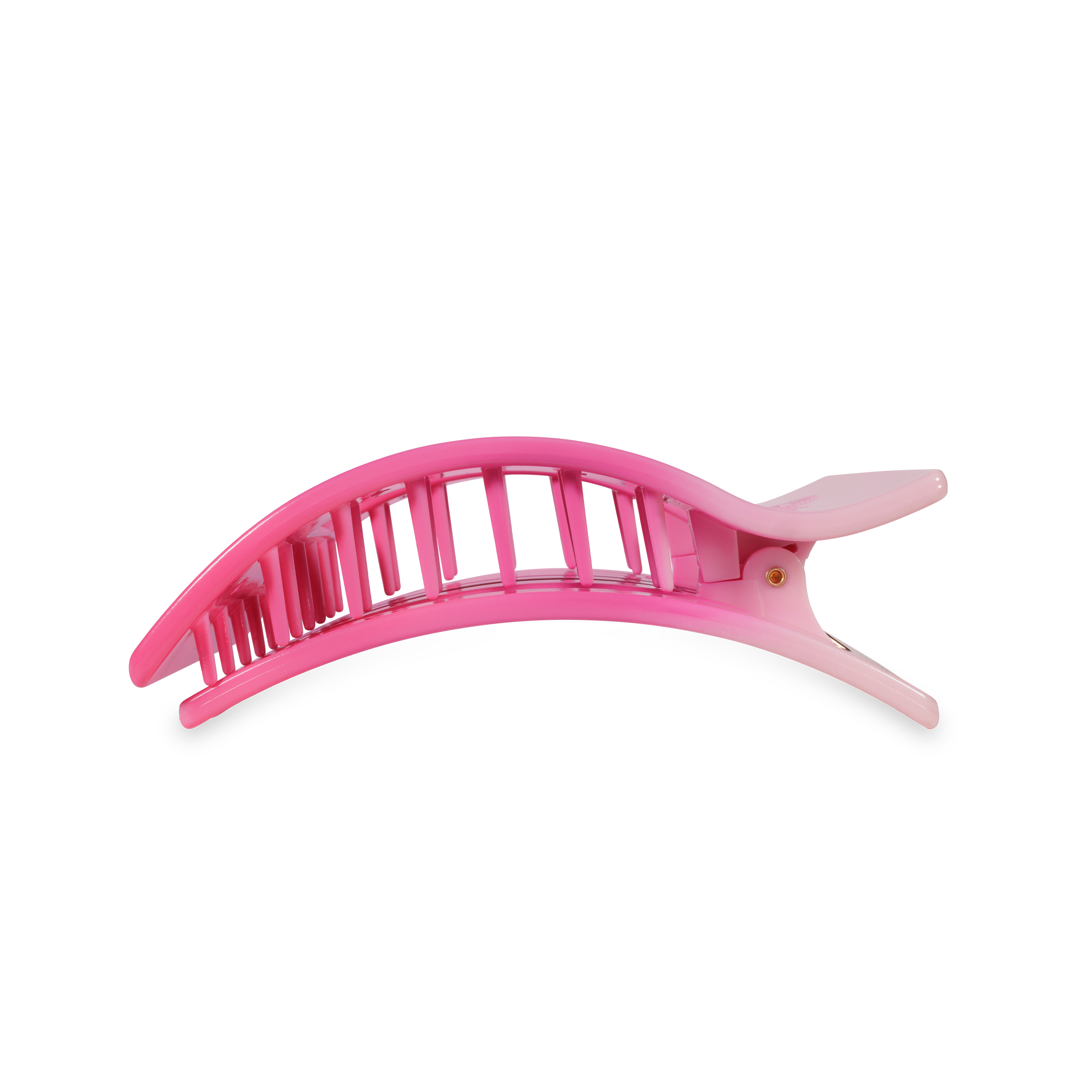 Lean back and relax - comfort just got a new shape. Introducing the TELETIES Kiss & Tell Large Flat Rectangle Hair Clip in Pink, the newest addition to our best-selling Flat Clip Collection. Joining the original Round and Square styles, this elevated rectangular design offers the same flat-back comfort and stronghold TELETIES is known for - now with a sleek, modern style. Flat-back design = comfortable to lay back in Chic rectangular shape adds an elevated, on-trend look Strong, flexible hold with bendable teeth Nearly unbreakable, lightweight material Works for all hair types Perfect for lounging, travel, yoga and daily wear