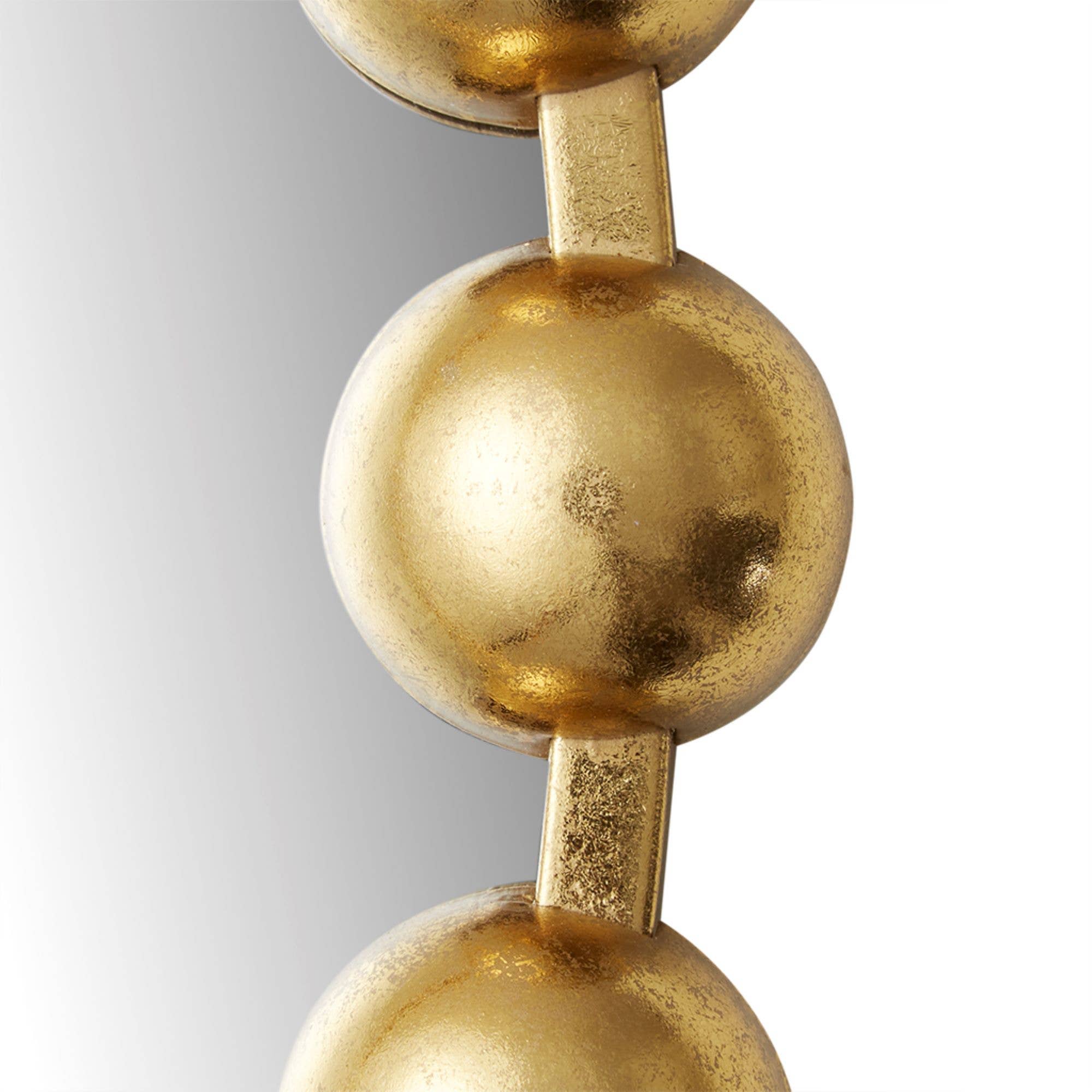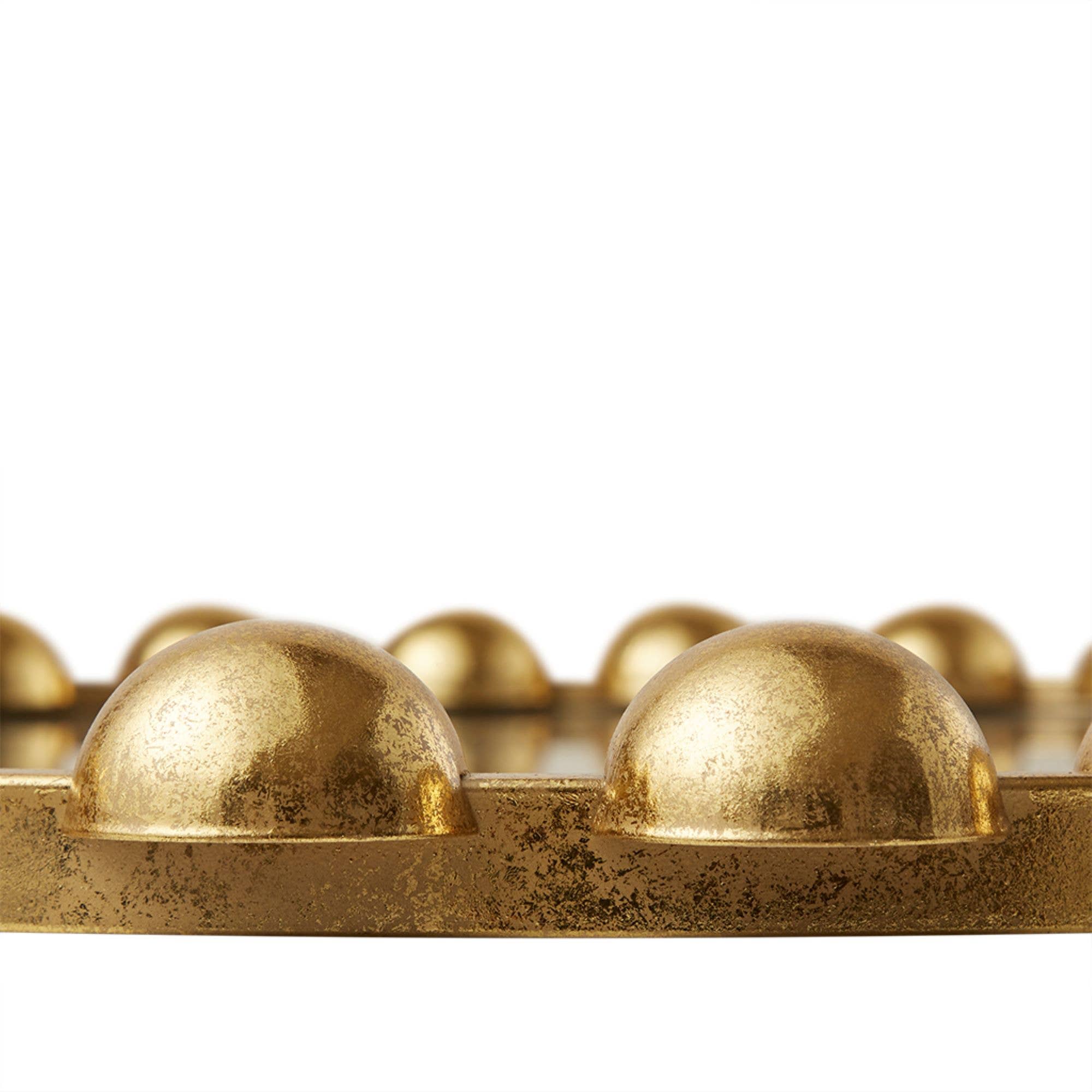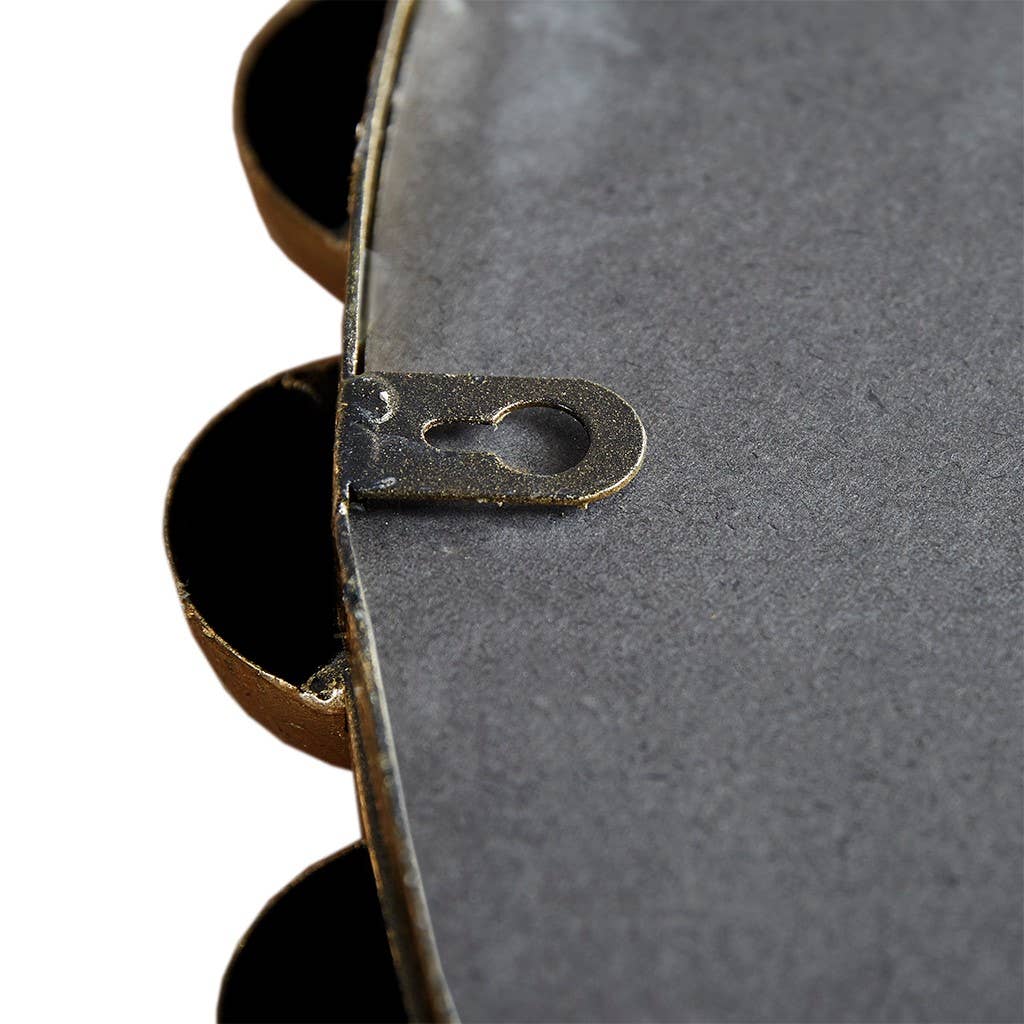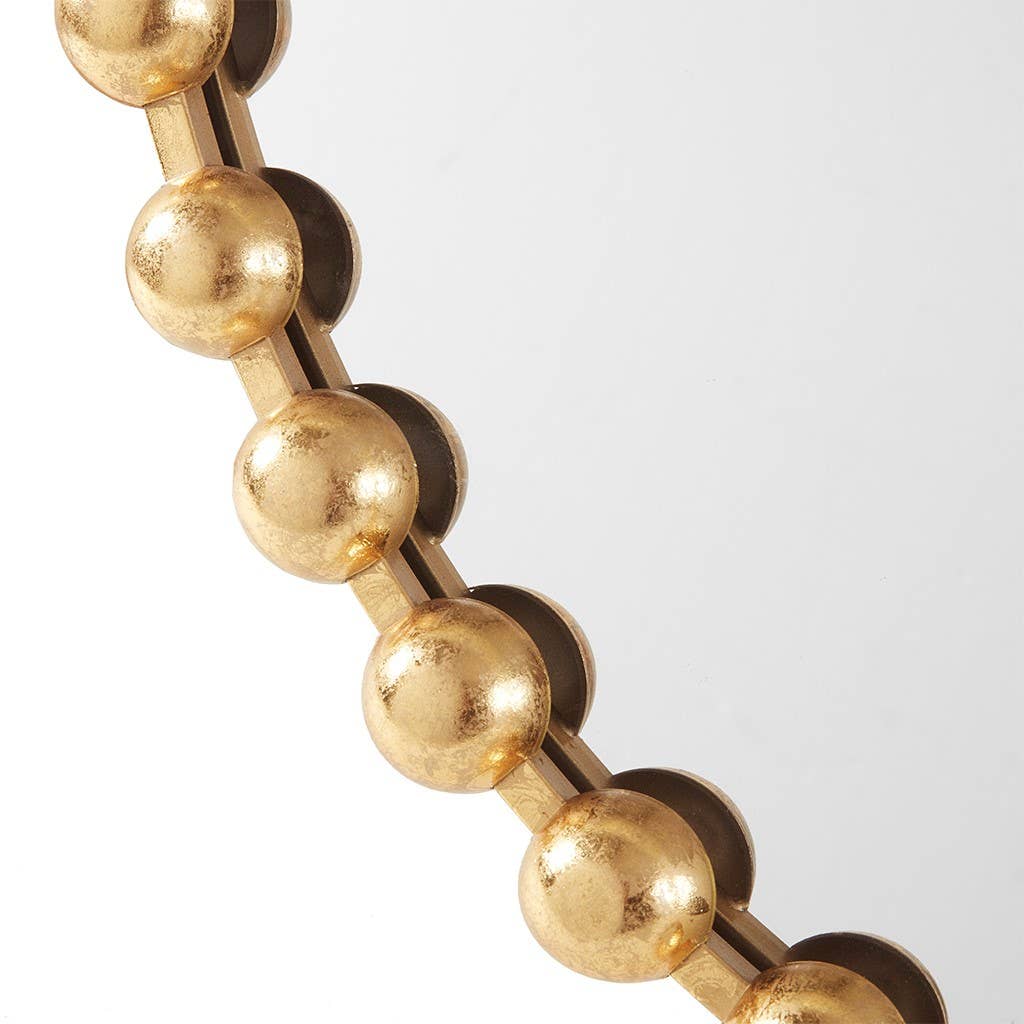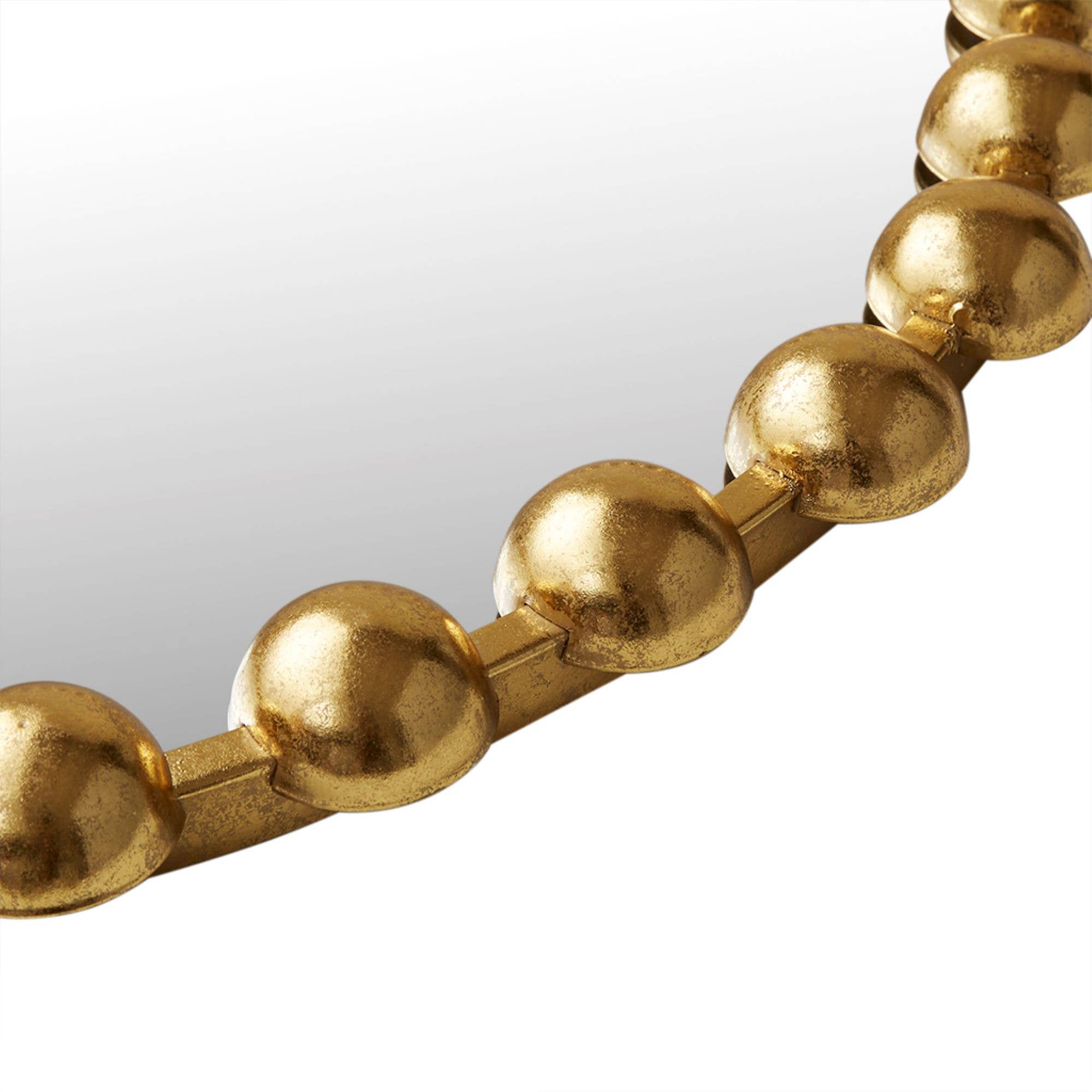 This round mirror features a stylized spherical iron frame finished with an antique metallic gold foil, creating a rich sheen and light speckled, distressed pattern effect. The keyhole hook fixture on the back of the mirror allows for effortless hanging on your wall. Incorporate this wall decor mirror into any room or space, for the perfect combination of modern glam and flair. Wipe clean with damp cloth and handle with care.