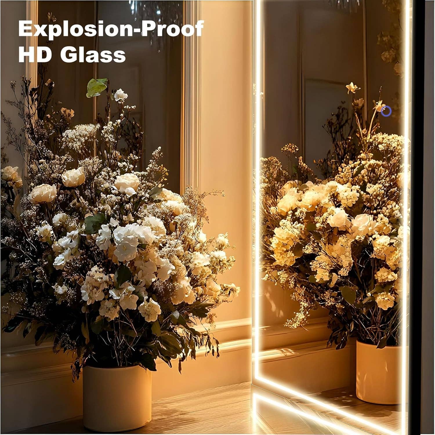 Elevate your dressing routine with an arched full-length mirror that doubles as a glow-boosting centerpiece. In a sleek black frame, this 63" x 20" mirror delivers a complete, true-to-life reflection while adding a touch of modern elegance to any room—bedroom, living room, or cloakroom. * Full-body view: 63" x 20" size provides a complete reflection for outfits and styling from head to toe. * Integrated LED lighting: energy-efficient strips illuminate evenly for precise visibility during dressing and makeup. * 3 color temperatures with adjustable brightness: switch between white, warm, and yellow tones via a smart touch button to suit any time of day or mood. * HD nano glass: 3.2mm high-definition glass with a pure silver layer for exceptional clarity and accurate reflections. * Safety-first design: upgraded explosion-proof nano glass helps prevent shattering and splashing for peace of mind. * Versatile placement: comes with a standing holder for easy setup, and can be leaned or wall-mounted (hori